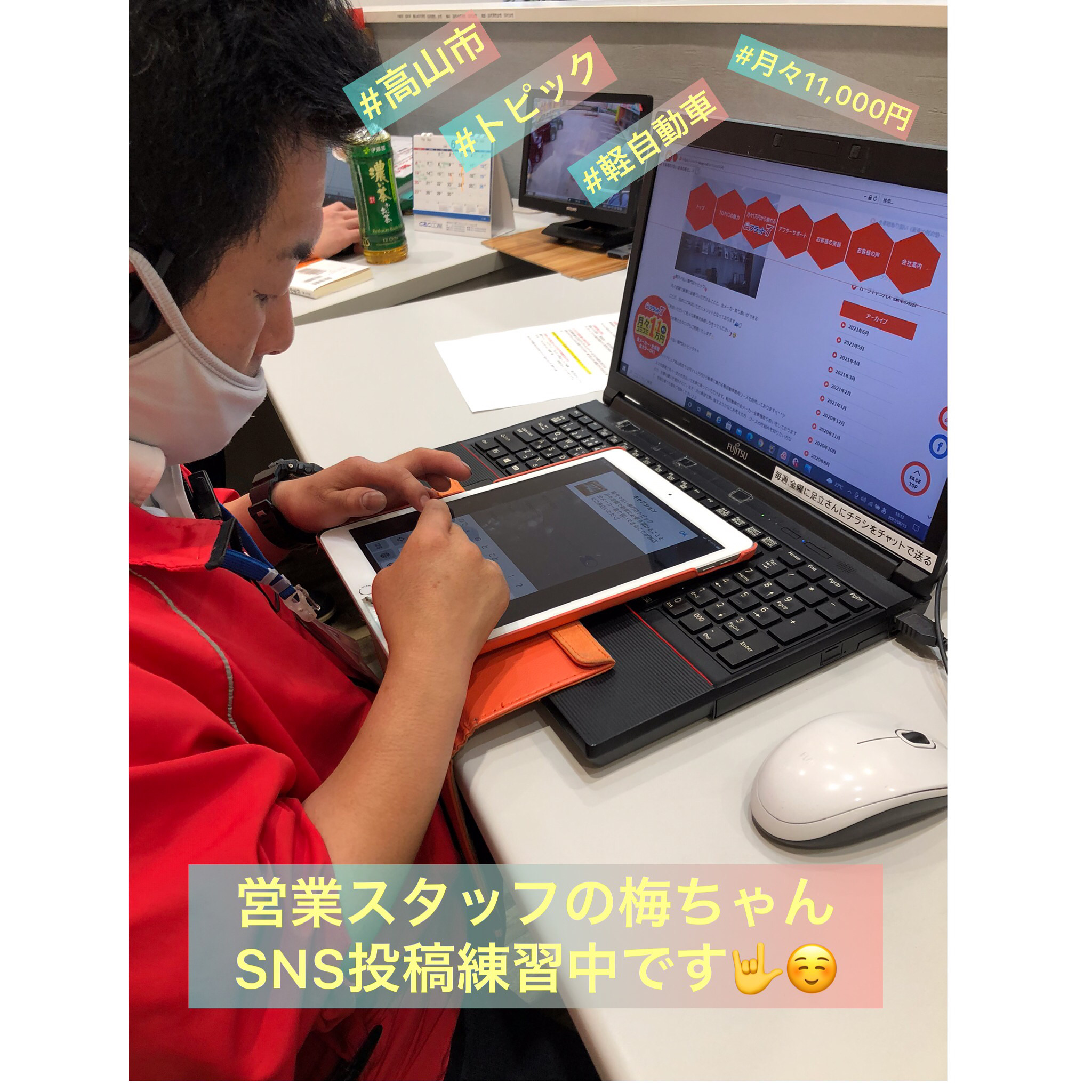SNSの更新やHPを現在、当番制にしてるので普段コーティングや洗車をしてるスタッフも練習しております!(^^)!